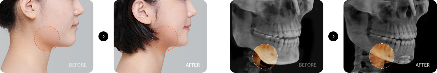 입꼬리 사각턱은 입꼬리 바로 옆부분의 돌출된 턱뼈를 말하며, 귀밑 사각턱 다음으로 턱에 있는 2번째 사각턱으로 볼 수 있습니다. 입꼬리 사각턱이 발달한 경우 턱끝 옆부분이 넓어보여 얼굴이 길고 넓적하게 보일 수 있는데, 브라운 입꼬리 사각턱 수술은 과도하게 발달된 사각턱을 절제하여 아름다운 얼굴라인을 완성합니다.