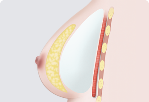 가슴 근육이 발달한 경우에 가능한 방법으로 수술이 간편한 것이 특징이며 처진 유방에 효과적입니다. 단, 구형구축의 가능성이 있어 세심한 관리가 필요합니다.