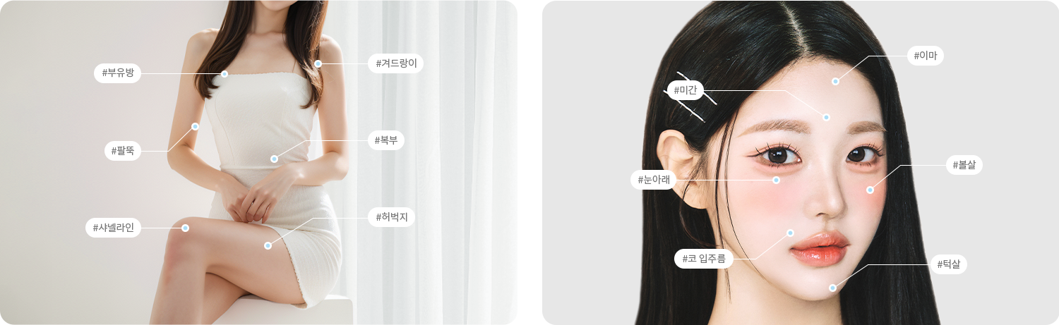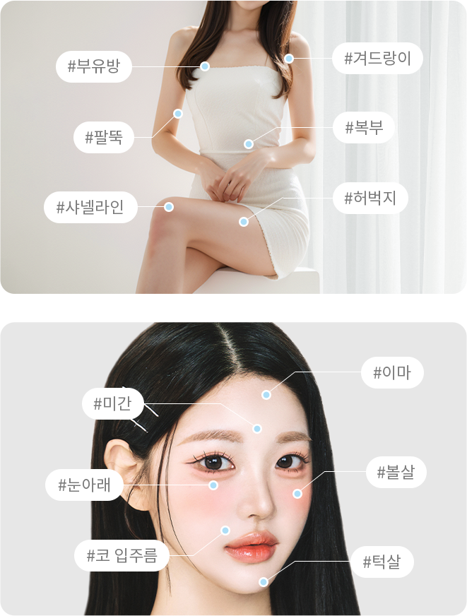 대표적인 부위로는 바디의 경우 복부나 허리, 허벅지, 팔, 종아리 등이 있으며 얼굴의 경우 볼,